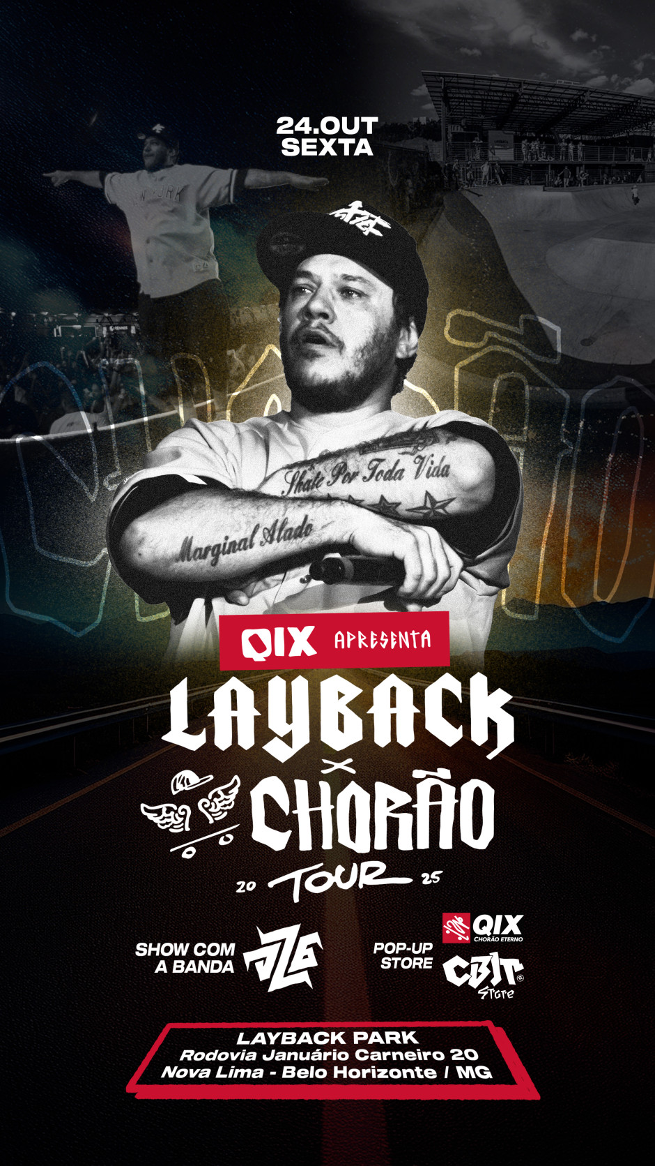 BH recebe a segunda parada da Layback Chorão Tour com show da DZ6 e muito skate ao vivo com atletas da QIX. A casa será palco de uma verdadeira imersão na cultura urbana, com a pop-up store da collab QIX x Chorão trazendo itens exclusivos. Uma noite de energia, atitude e conexão com a cena street.