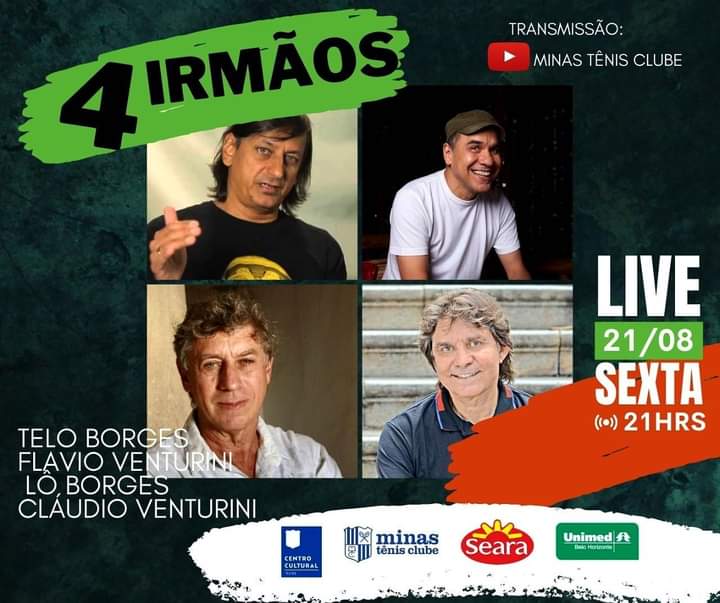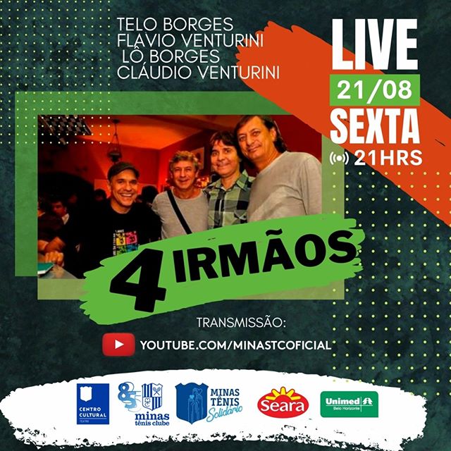 Nesta sexta-feira, dia 21 de agosto, às 21h, o nosso canal oficial do Youtube transmite a live “4 Irmãos”, que une, no palco do nosso Teatro os músicos Telo e Lô Borges e Flávio e Cláudio Venturini. ⠀ ⠀