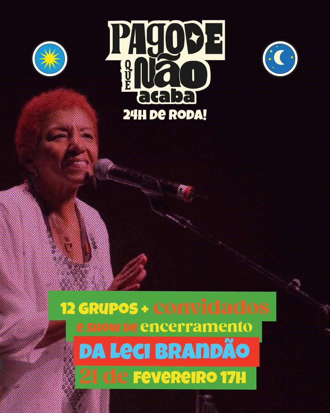 Para coroar essa jornada de 24 horas, teremos a honra de receber a madrinha Leci Brandão! Ela faz o show de encerramento, celebrando o sucesso do recorde e fechando o evento com chave de ouro.