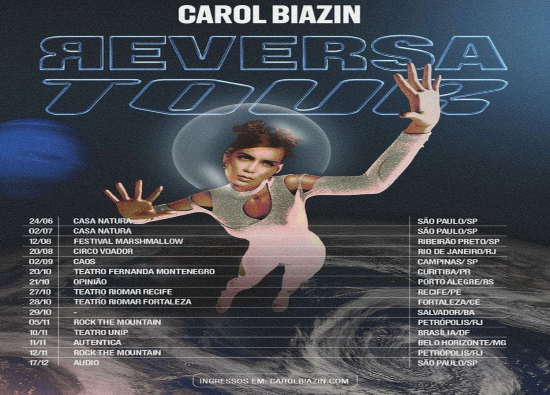 Após shows aclamados pelo público em grandes festivais recentes como Lollapalooza Brasil e MITA Festival, Carol Biazin chega para evidenciar ainda mais sua potência como cantora e performer com a REVERSA TOUR, que vai rodar o Brasil com 15 shows em 12 cidades.