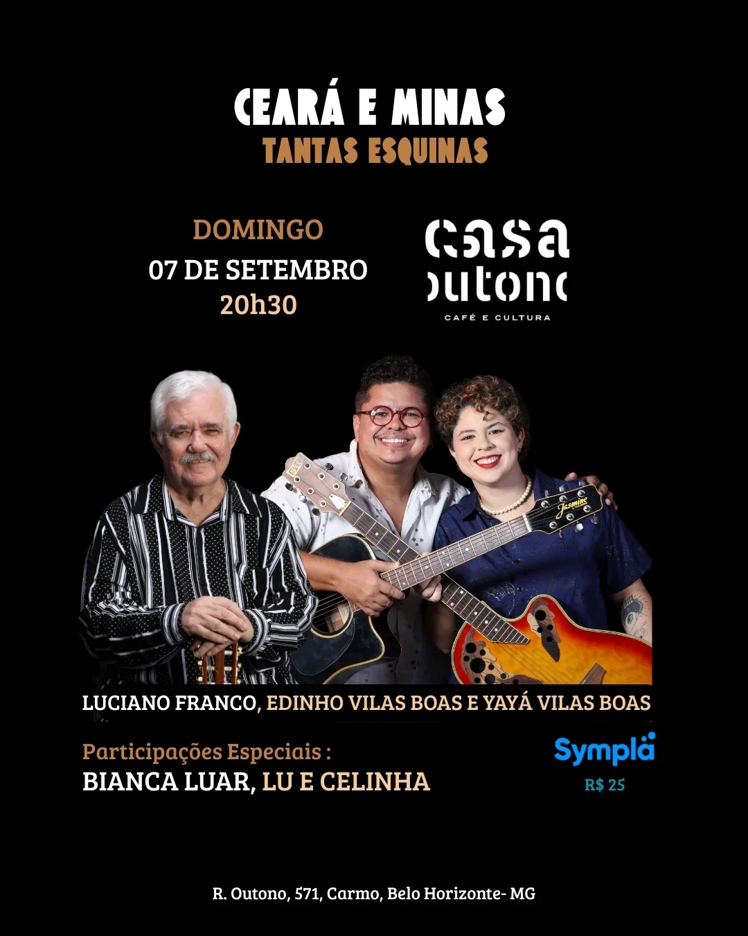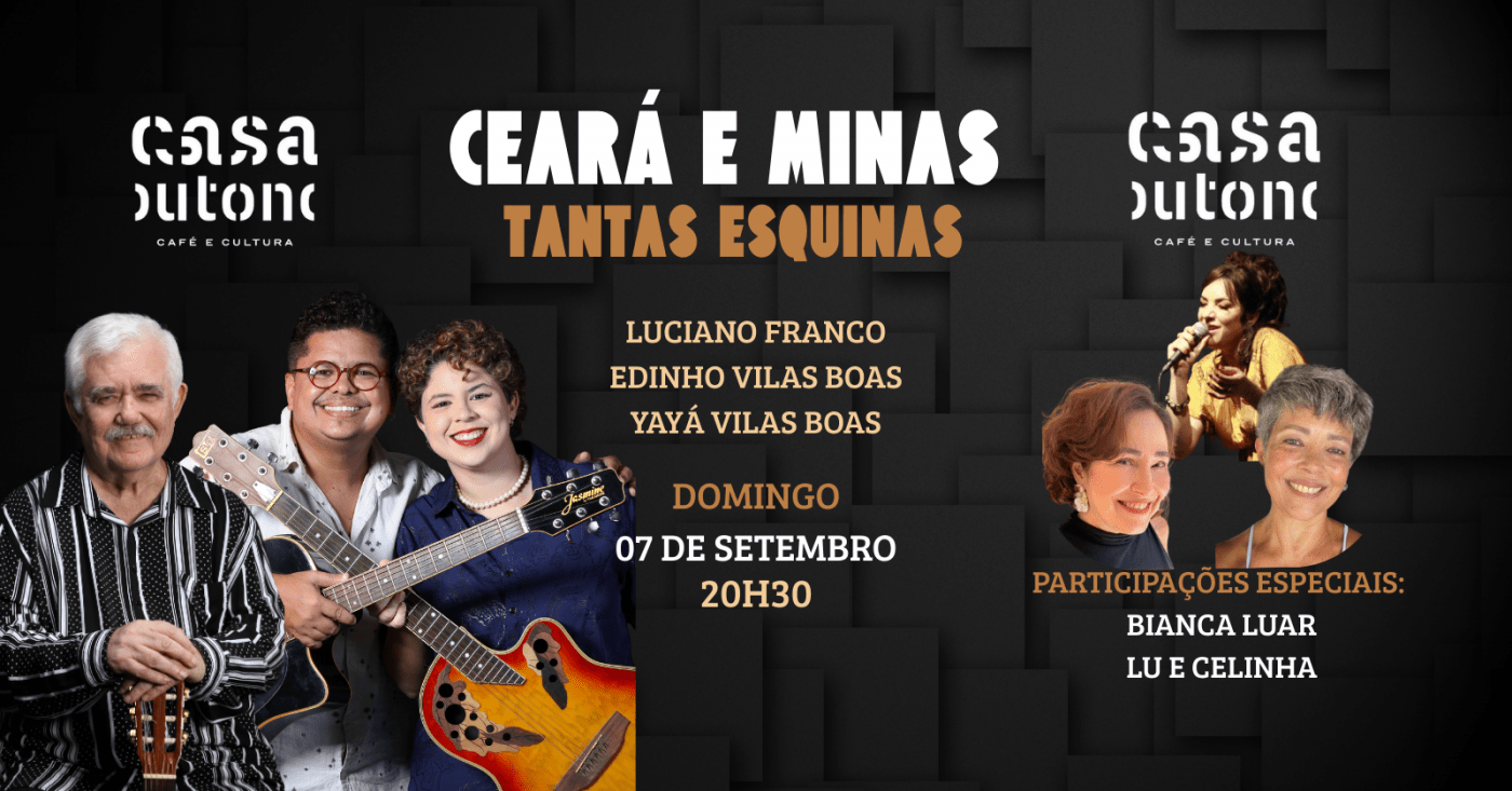 Artistas cearenses premiados em Minas Gerais e em diversas cidades do Brasil, Edinho Vilas Boas, Yayá Vilas Boas (pai e filha) e Luciano Franco realizam um espetáculo musical inédito, em encontro com artistas mineiros, incluindo o lançamento do disco “Casa das Flores”, de Luciano e de Paulinho Pedra Azul. E a participação de Bianca Luar, de Celinha Braga e Lu Braga, grandes artistas de Minas.