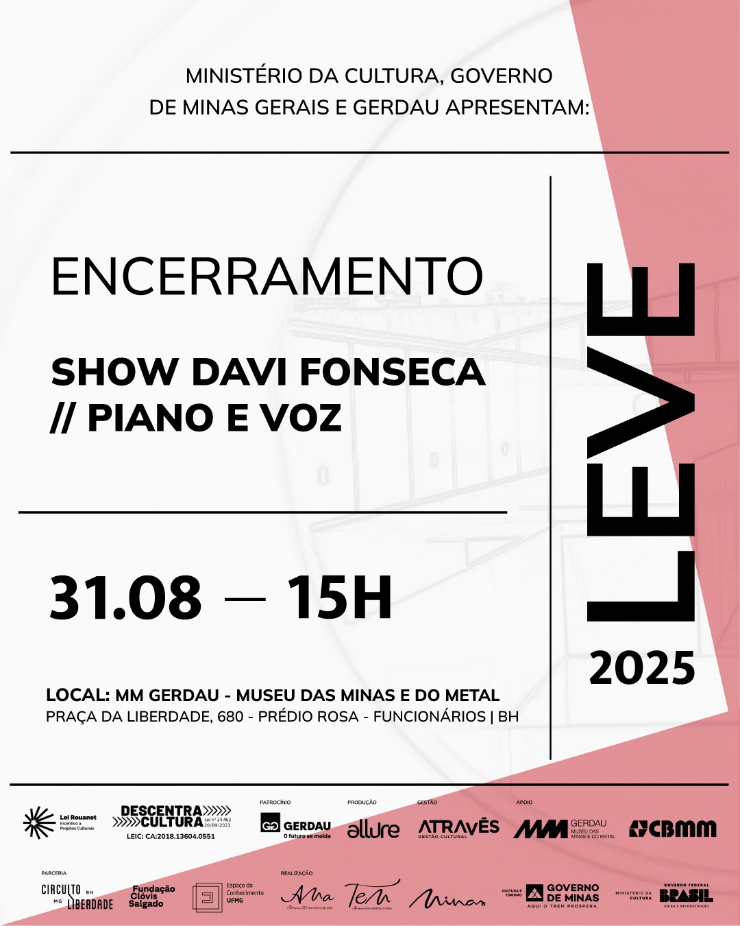 A exposição "Leve", iniciada em janeiro em Miguel Burnier (Ouro Preto) e que passou por Ouro Branco antes de ocupar o Terraço Paulo Mendes da Rocha no MM Gerdau – Museu das Minas e do Metal terá encerramento no dia 31 de agosto, às 15h, com uma apresentação do pianista Davi Fonseca, reconhecido internacionalmente por sua técnica e sensibilidade, trazendo uma experiência sonora intimista e refinada em sintonia com o espírito da obra.
