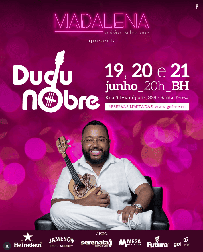 Dudu Nobre, chega a Belo Horizonte depois de 2 anos para agitar o Madalena nos dias 19, 20 e 21 de junho! O consagrado compositor e cantor brasileiro começou cedo sua jornada musical: aos seis anos já estudava piano clássico e, aos nove, ganhou o seu cavaquinho, instrumento que se tornaria seu fiel parceiro em uma carreira marcada por sucessos no Brasil e no mundo. Além de brilhar como intérprete, Dudu também é autor de sambas-enredo vitoriosos e é reconhecido como um dos maiores sambistas do país. A presença de Dudu Nobre no Madalena, em BH, promete noites inesquecíveis no Santa Tereza, celebrando o samba com maestria.