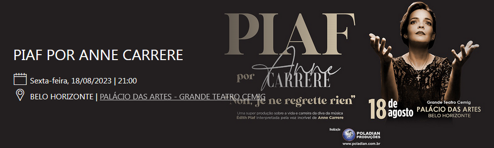 Em agosto, Anne Carrere volta ao Brasil com o show “Piaf! Non, je ne regrette rien”. Maior intérprete de Piaf, a cantora francesa se apresentará em Belo Horizonte (MG), no dia 18 de agosto, no Palácio das Artes.