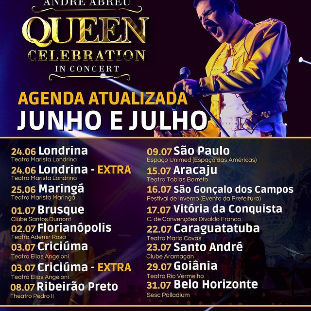 Liderada por Freddie Mercury, figura emblemática nos palcos e fora deles, que nos deixou há exatos 30 anos, o grupo de rock britânico tem sua trajetória musical contada no show Queen Celebration in Concert em turnê pelo Brasil.