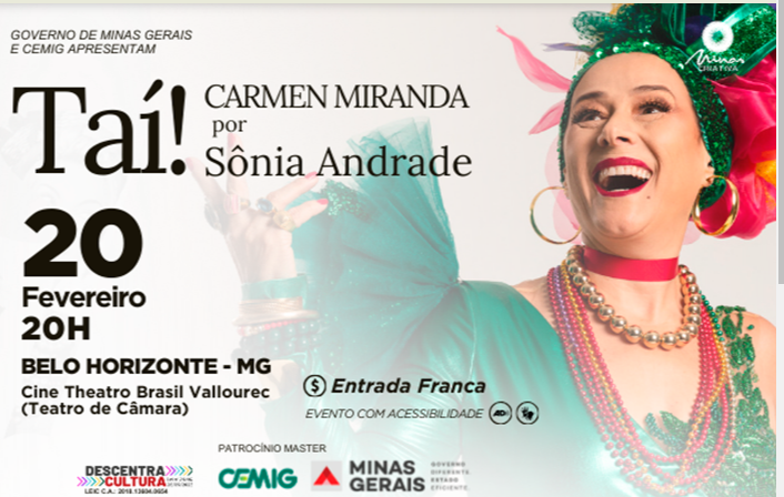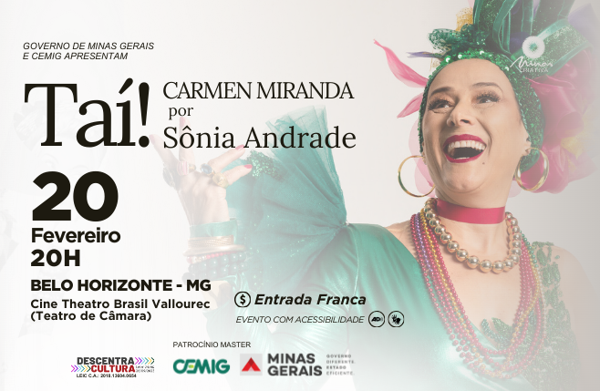 A música popular brasileira deve muito à Carmen Miranda, uma das maiores artistas do país, cuja carreira internacional levou a cultura brasileira a muitos cantos do mundo. Com a turnê “Taí! Carmen Miranda", a cantora Sônia Andrade traz ao público uma homenagem vibrante a essa ícone. O objetivo é preservar, difundir e celebrar a música e cultura de Carmen para as novas gerações. O projeto tem o patrocínio da Cemig, por meio da Lei Estadual de Incentivo à Cultura de Minas Gerais e conta com o apoio da empresa Plastifica, e das secretarias de cultura das cidades de Brumadinho e Conceição do Mato Dentro.