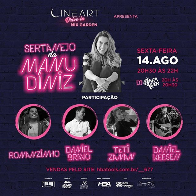 A primeira grade de apresentações do @cinedriveinmixgarden já está marcada: na sexta-feira, dia 14 de agosto, a cantora @manuela_diniz vai apresentar o melhor estilo sertanejo com releituras e canções próprias, com início previsto para 20h30.