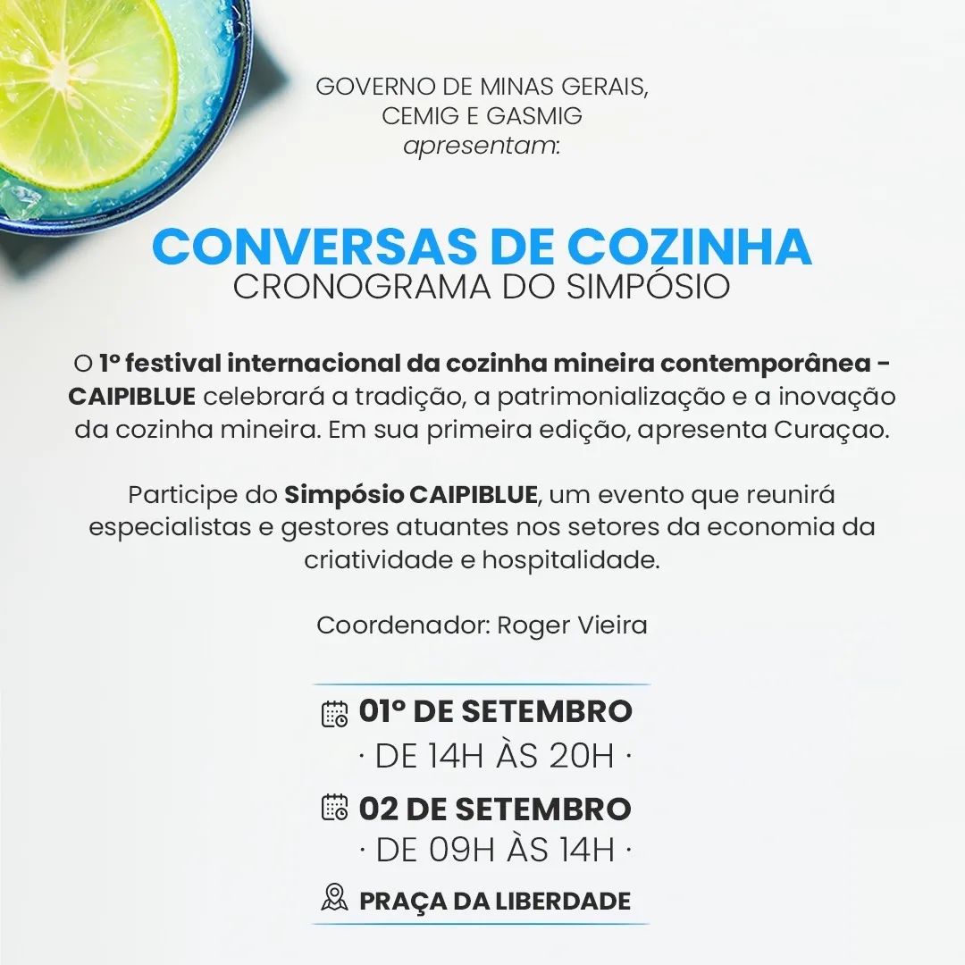 Belo Horizonte será sede do 1º Festival Internacional da Cozinha Mineira Contemporânea - CAIPIBLUE, um evento que celebrará a tradição, a patrimonialização e a inovação da cozinha mineira por meio diversas ações, como simpósio, rodadas de negócios, feira de produtores mineiros, área gastronômica da cozinha mineira clássica e atrações culturais, em diálogo com Curaçao, país convidado para a estreia desse projeto.