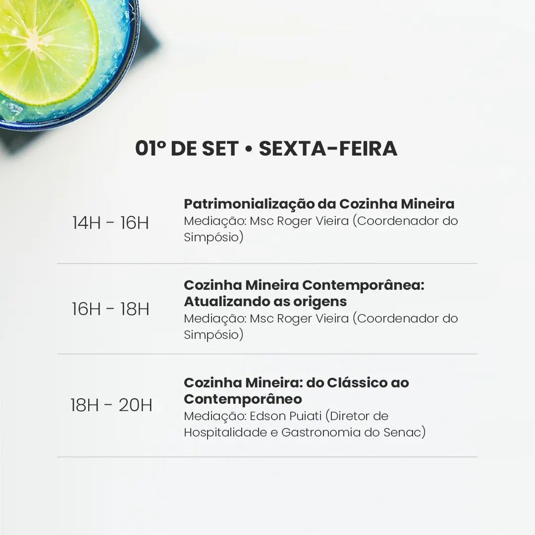 A exposição de produtores de Minas Gerais e a área gastronômica da cozinha clássica mineira ocorrerão nos seguintes dias e horários: Dia 01º de setembro, de 18h às 22h, 02 e 03 de setembro, de 11h às 22h.