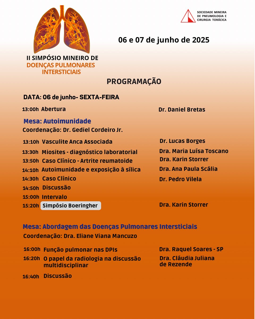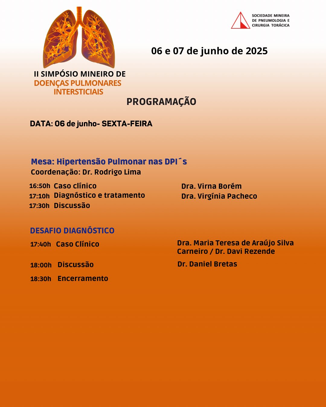 O II Simpósio Mineiro de Doenças Intersticiais acontece nos dias 06 e 07 de junho de 2025, na Associação Médica de Minas Gerais.