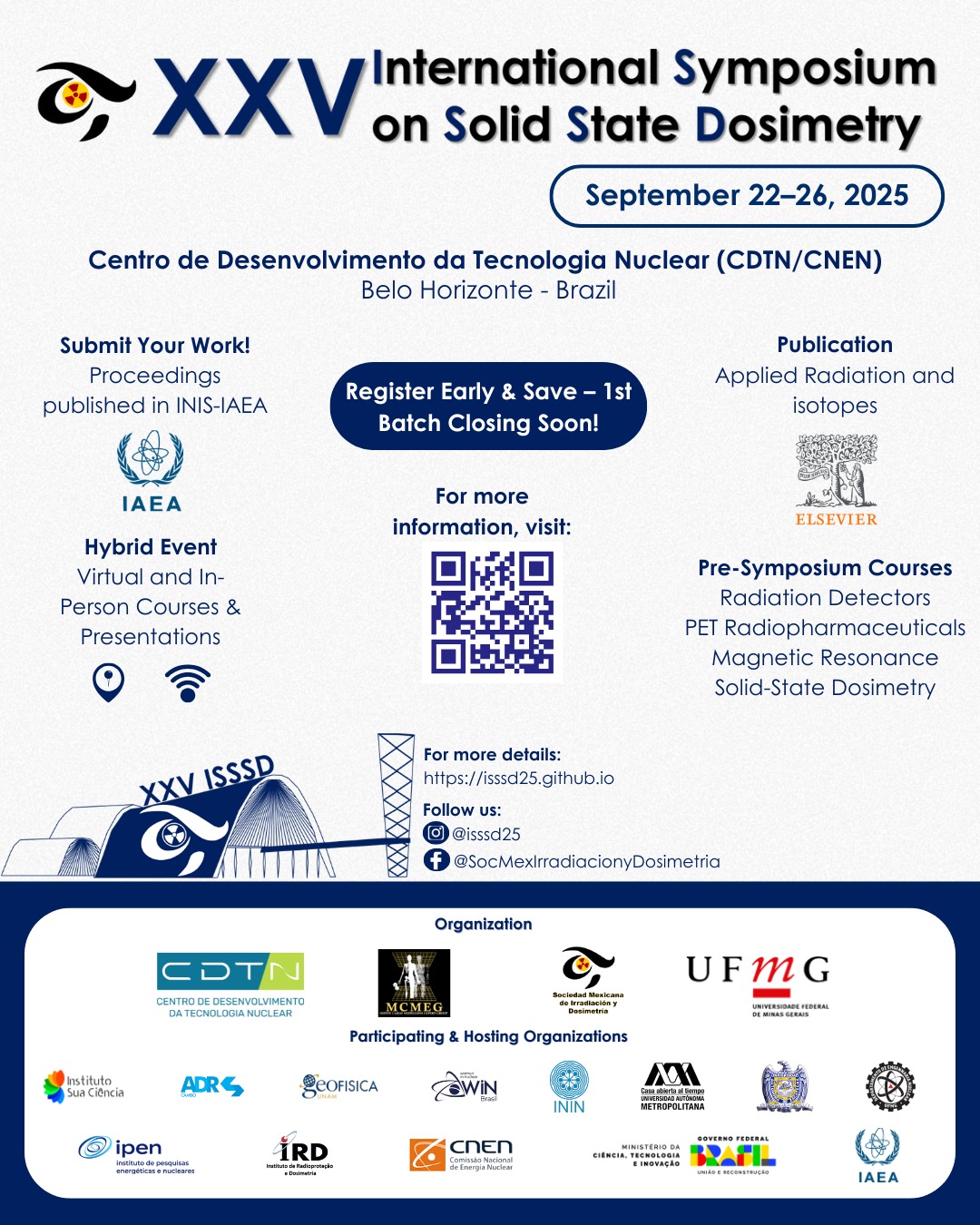 O Centro de Desenvolvimento de Tecnologia Nuclear (CDTN), unidade da Comissão Nacional de Energia Nuclear (CNEN) em Belo Horizonte (MG), recebe as atividades presenciais da 25ª edição do ISSSD, que também contará com programação remota. O encontro reunirá especialistas renomados como conferencistas, além de 100 a 150 apresentações de trabalho, com contribuições de pesquisadores de cerca de 25 países.