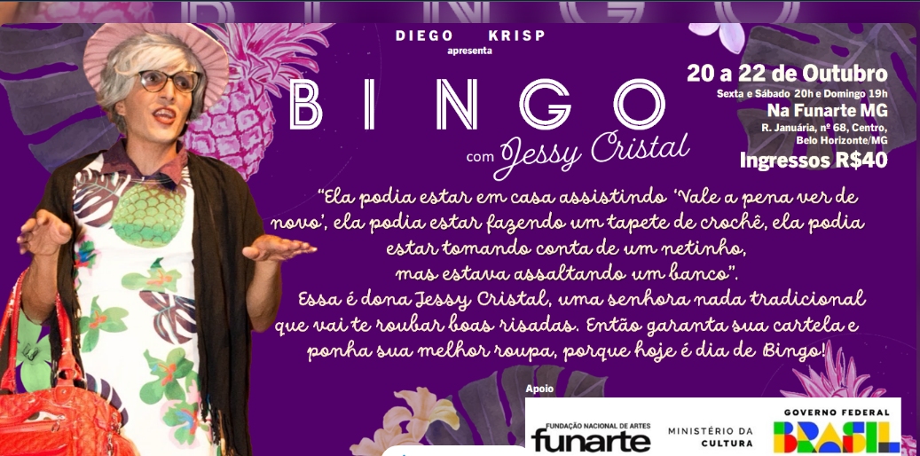 A Funarte MG, localizada no centro de Belo Horizonte, abre as cortinas para a comédia “Bingo com Jessy Cristal”, um monólogo com atuação de Diego Krisp que também assina e dirige a montagem.