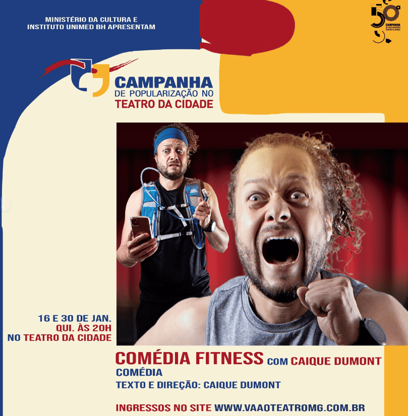 Em Comédia Fitness, o humorista Caique Dumont traz para o palco vivências desde que abandonou o sedentarismo. Trilhas, corrida e academia viraram hobbies que passaram a exigir uma preparação física.