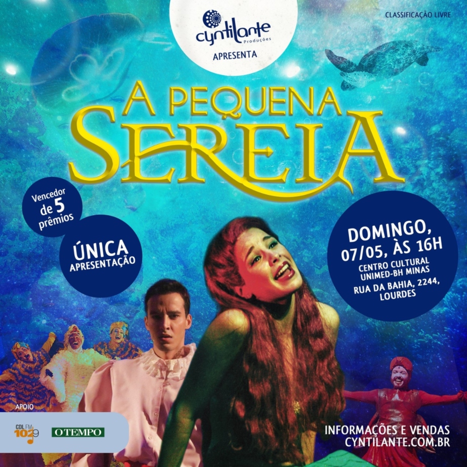 No dia 7/5, domingo, às 16h, o Teatro do Centro Cultural Unimed-BH Minas recebe a peça infantil “A Pequena Sereia”, produção da Cyntilante.