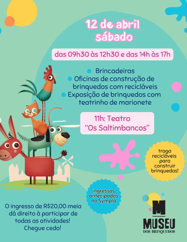 No dia 12 de abril (sábado), o espetáculo "Os Saltimbancos" abre a temporada de teatro de 2025 com toda a magia da Copas Produções. Prepare-se para se divertir, se emocionar e cantar junto com a criançada!