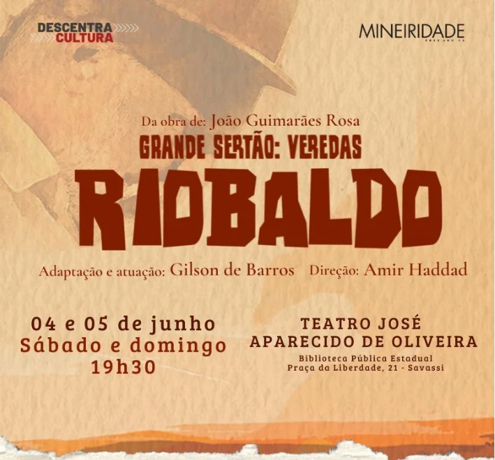 Sucesso nos palcos do Rio e São Paulo, a peça "RIOBALDO”, adaptação teatral da obra Grande Sertão: Veredas, de João Guimarães Rosa, com direção de Amir Haddad, fará duas sessões especiais, em Belo Horizonte, na Biblioteca Pública Estadual, nos dias 04 e 05/06.