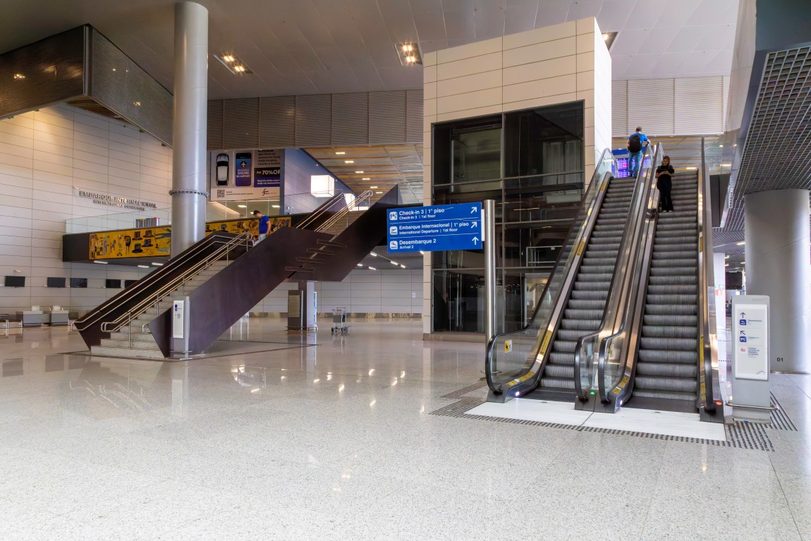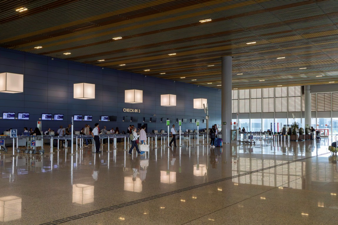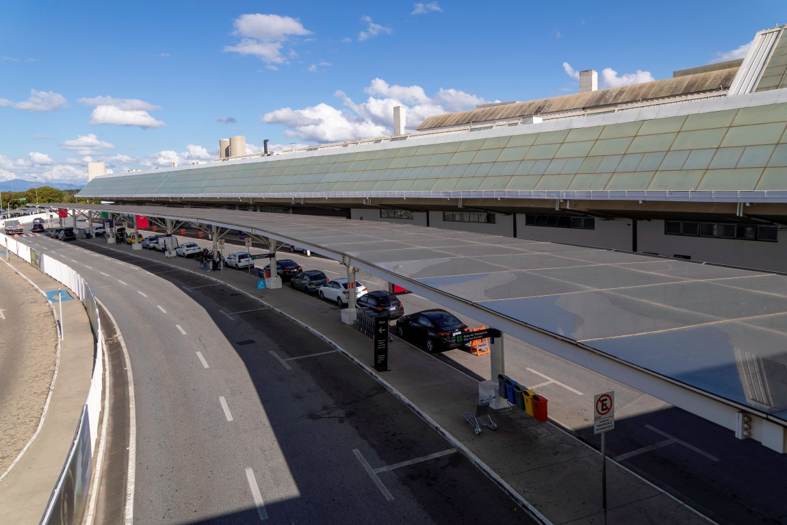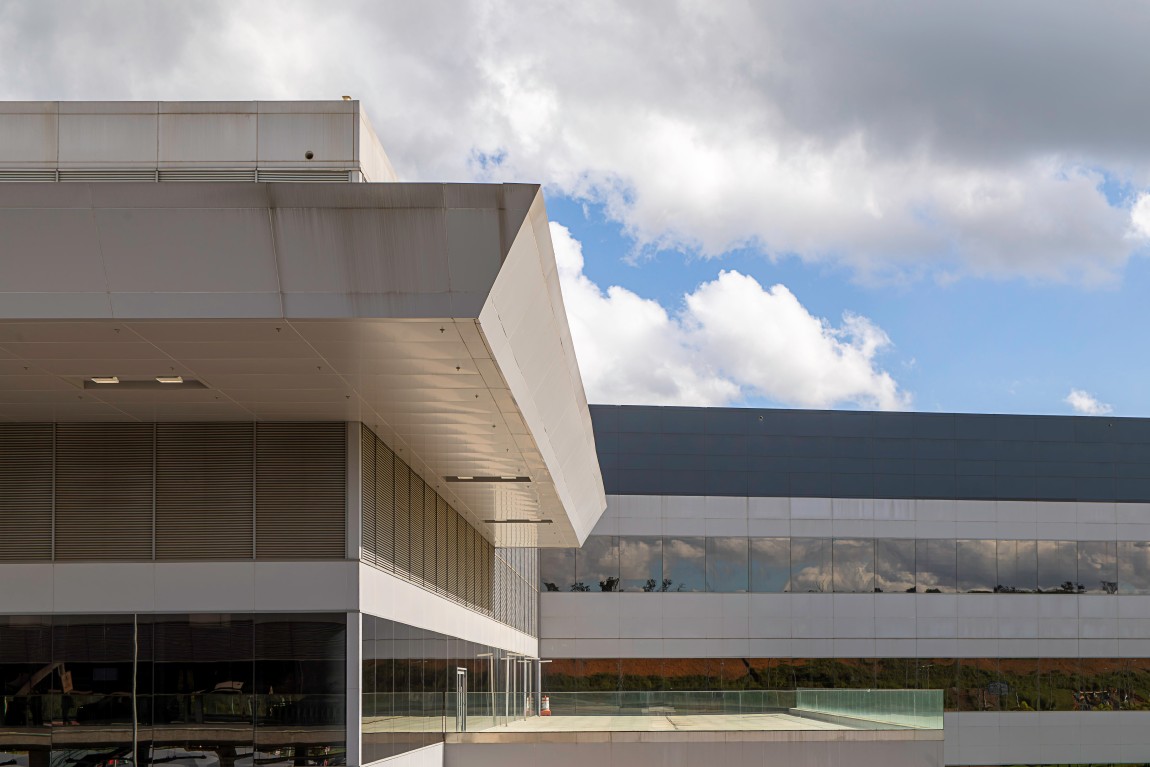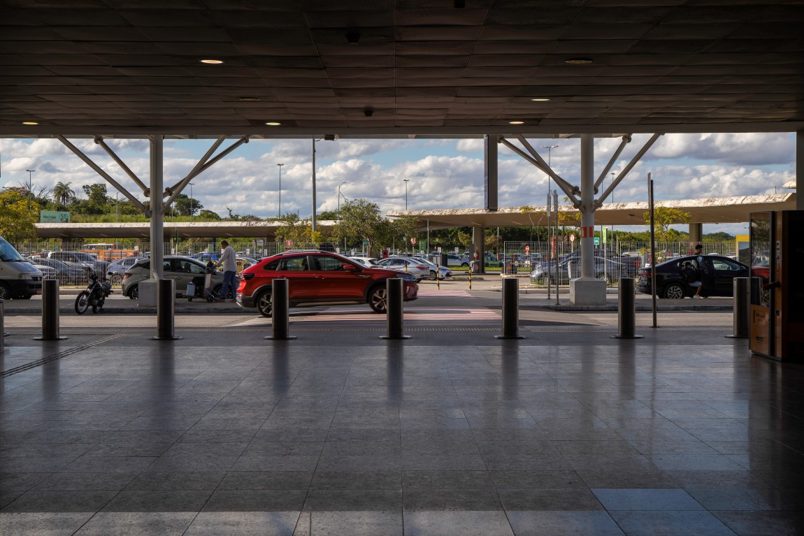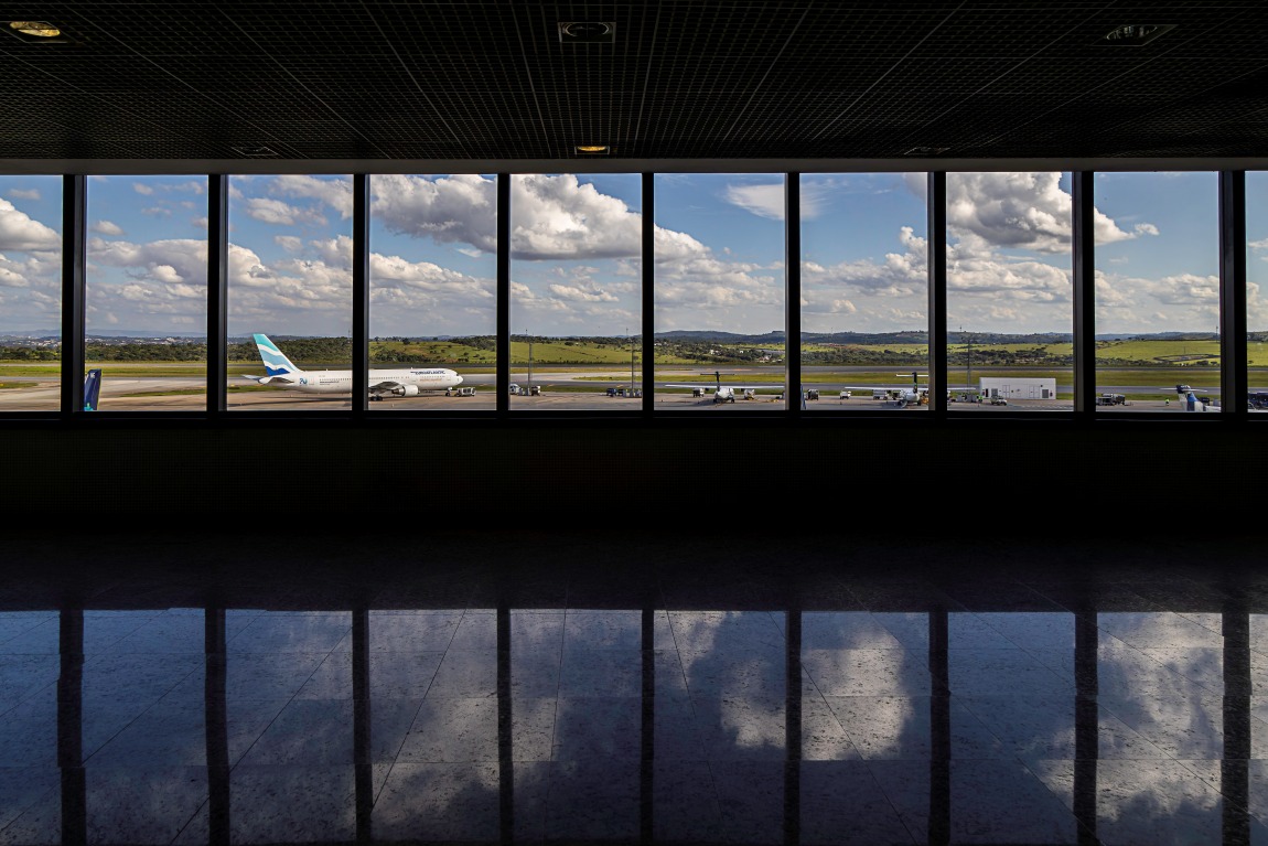 O Aeroporto Internacional de Belo Horizonte, conhecido como Aeroporto de Confins ou Tancredo Neves, foi inaugurado em 1984 e ocupa uma área de aproximadamente 13,8 milhões de m². Localizado a cerca de 40 km do centro de Belo Horizonte, no município de Confins, é um dos principais terminais aéreos do país. Sua arquitetura reúne traços modernistas — com concreto aparente, grandes vãos livres e pé-direito elevado — e intervenções contemporâneas que introduzem vidro, estruturas metálicas e longos corredores lineares.