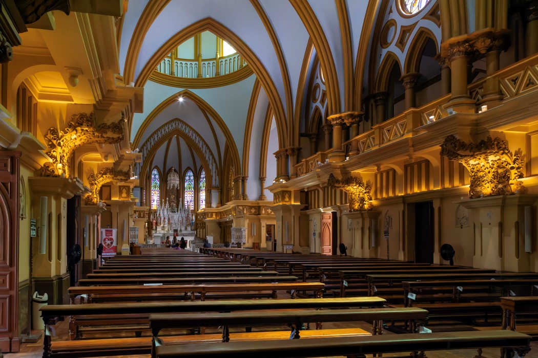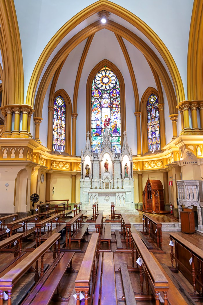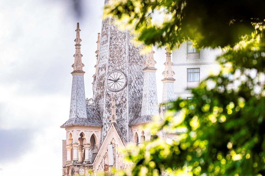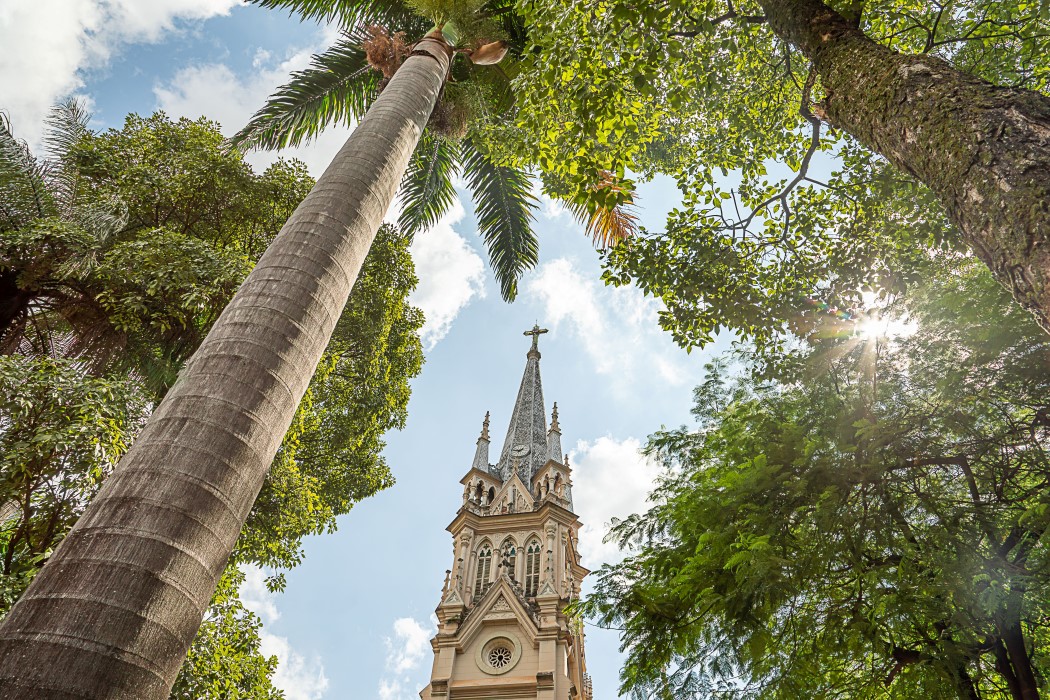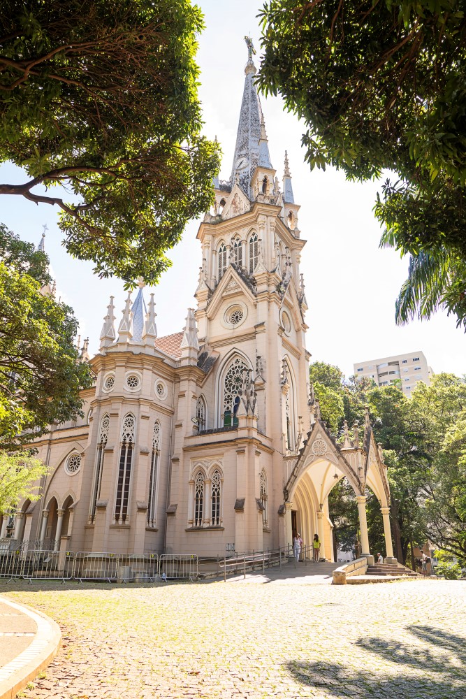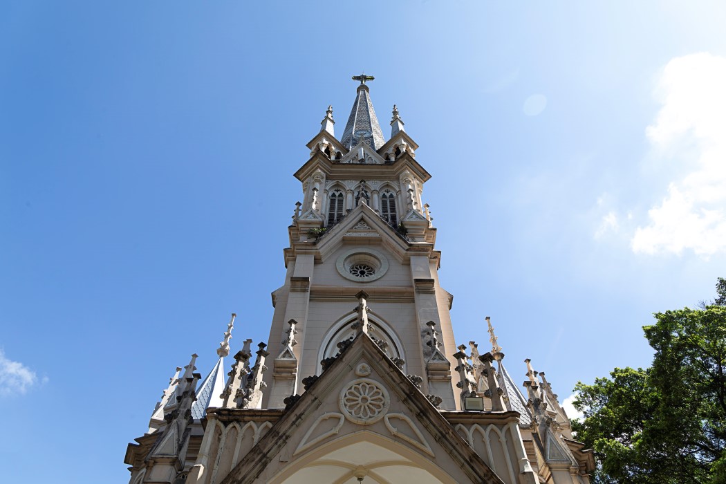 A Igreja Nossa Senhora da Boa Viagem foi construída entre 1913 e 1923, sua arquitetura em estilo neogótico conta com uma torre central, cerca de cem pináculos, arcos pontiagudos na entrada e vitrais coloridos. A estrutura foi concebida para lembrar mãos unidas em oração, conduzindo o olhar para o alto. A fachada é composta por detalhes em pedra lavrada e telhado de cerâmica. O interior tem uma nave única que leva ao altar principal, com capelas nas laterais, colunas decoradas e teto de madeira aparente. A casa paroquial e um alojamento anexo também fazem parte do conjunto.