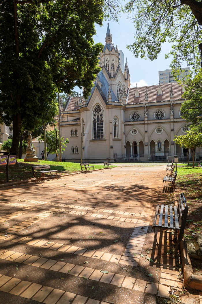 Na frente da igreja, há um pátio de pedra com bancos e árvores, conectado à Praça da Boa Viagem, que conta com caminhos em pedra e vegetação de médio e grande porte. O entorno é composto por prédios institucionais, comerciais e residenciais, em uma área central da cidade.