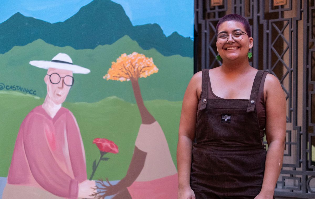 Cecília Castanha é artista visual, muralista, oficineira, habilitanda em Pintura na Escola de Belas Artes da UFMG e natural da cidade de Santa Luzia, Minas Gerais. Utiliza da experimentação para criar novas realidades e alternativas, com o objetivo de ver e vivenciar o mundo de forma crítica, porém leve e com poesia.