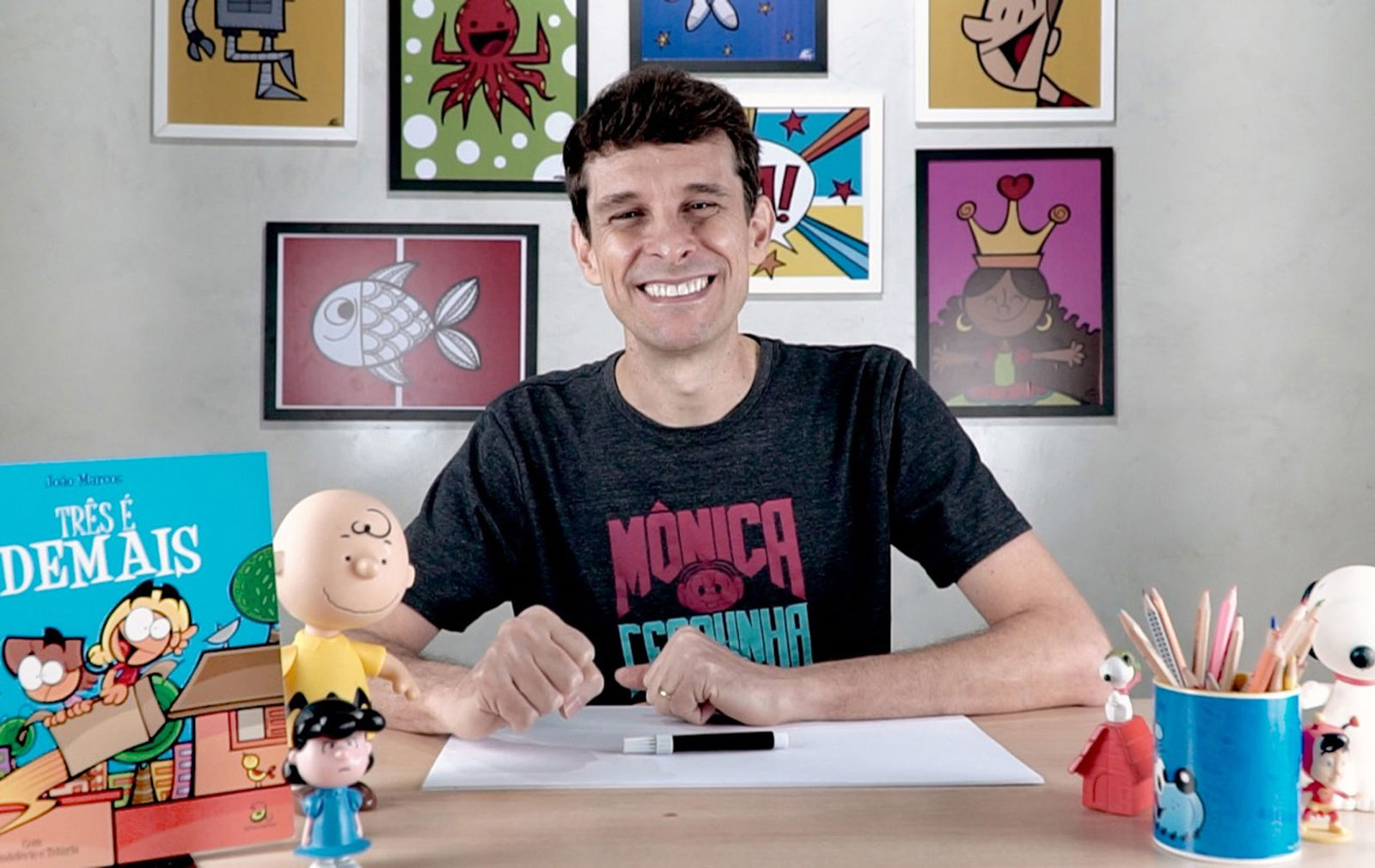 João Marcos convida as crianças a desenharem e a construírem sua expressão pessoal, explorando as características e possibilidades expressivas do desenho de cartum.
