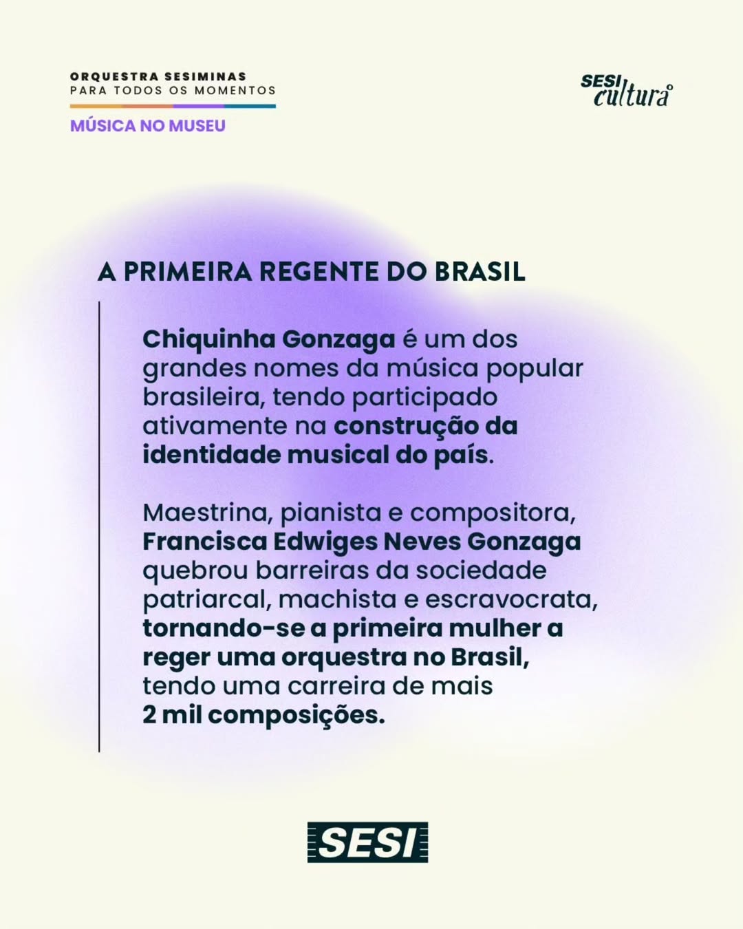 Em celebração ao Mês das Mulheres, a apresentação destaca a trajetória de Francisca Edviges Neves Gonzaga, compositora, pianista e maestrina que quebrou barreiras em sua época e ajudou a transformar a música brasileira. O repertório inclui algumas de suas obras mais emblemáticas, além de peças de seus contemporâneos, recriando a atmosfera cultural do período.