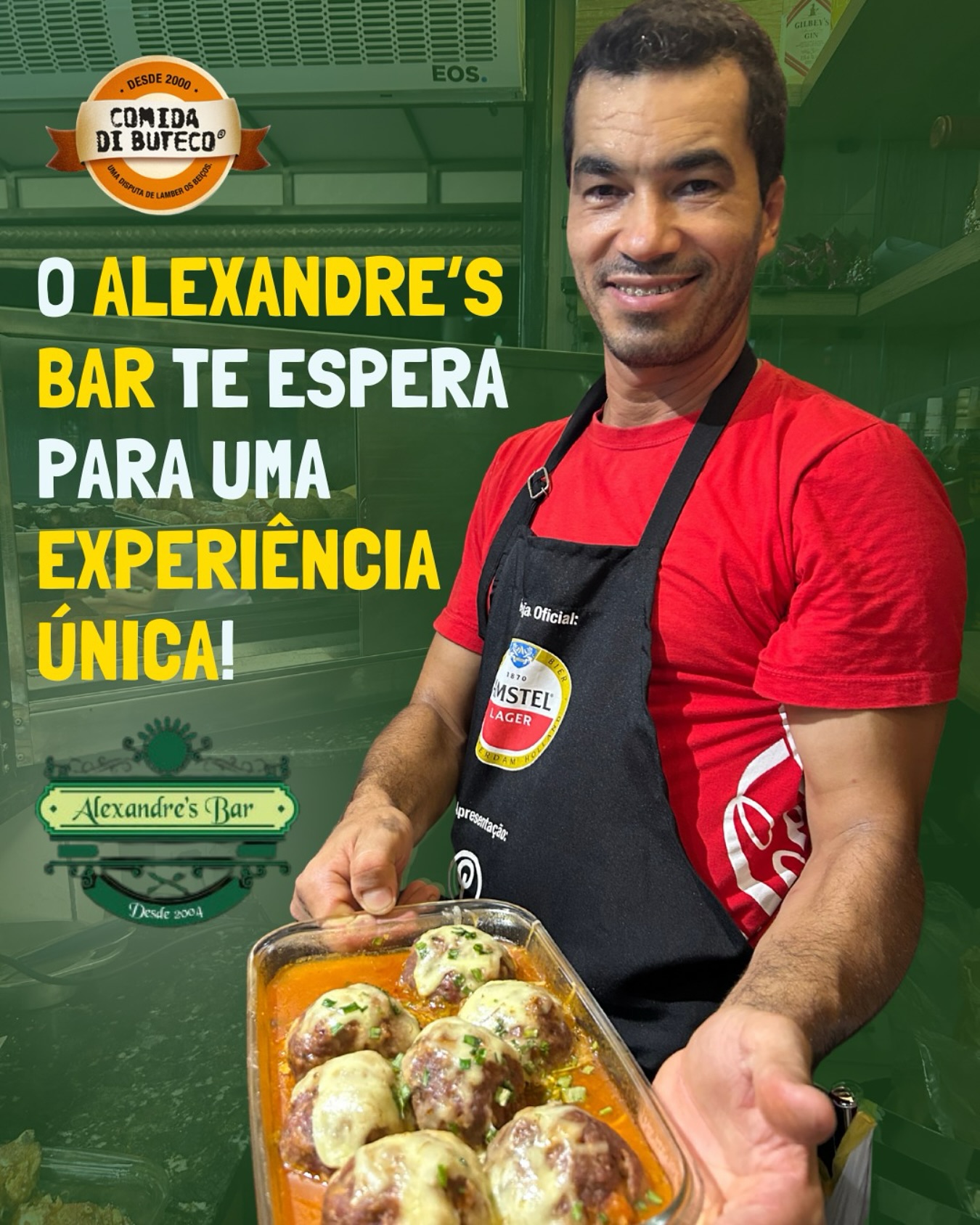 À frente da cozinha, o chef Alexandre Moreira imprime autenticidade em cada detalhe, transformando ingredientes simples em experiências que conquistam no primeiro sabor. Mais do que um lugar para comer e beber bem, o Alexandre’s Bar é um espaço de convivência, celebração e alegria, onde amigos se reúnem, histórias são compartilhadas e cada visita vira motivo para voltar.